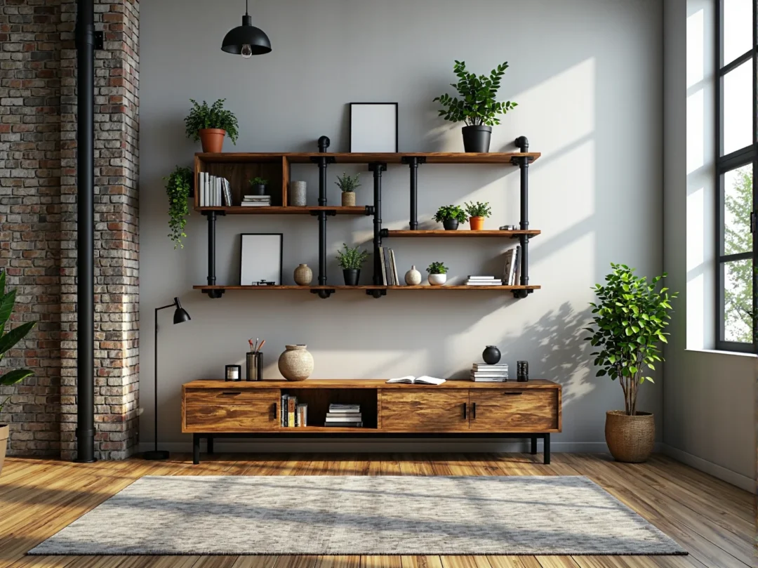Stylowa aranżacja salonu w stylu loft z wykorzystaniem półki z recyklingu.