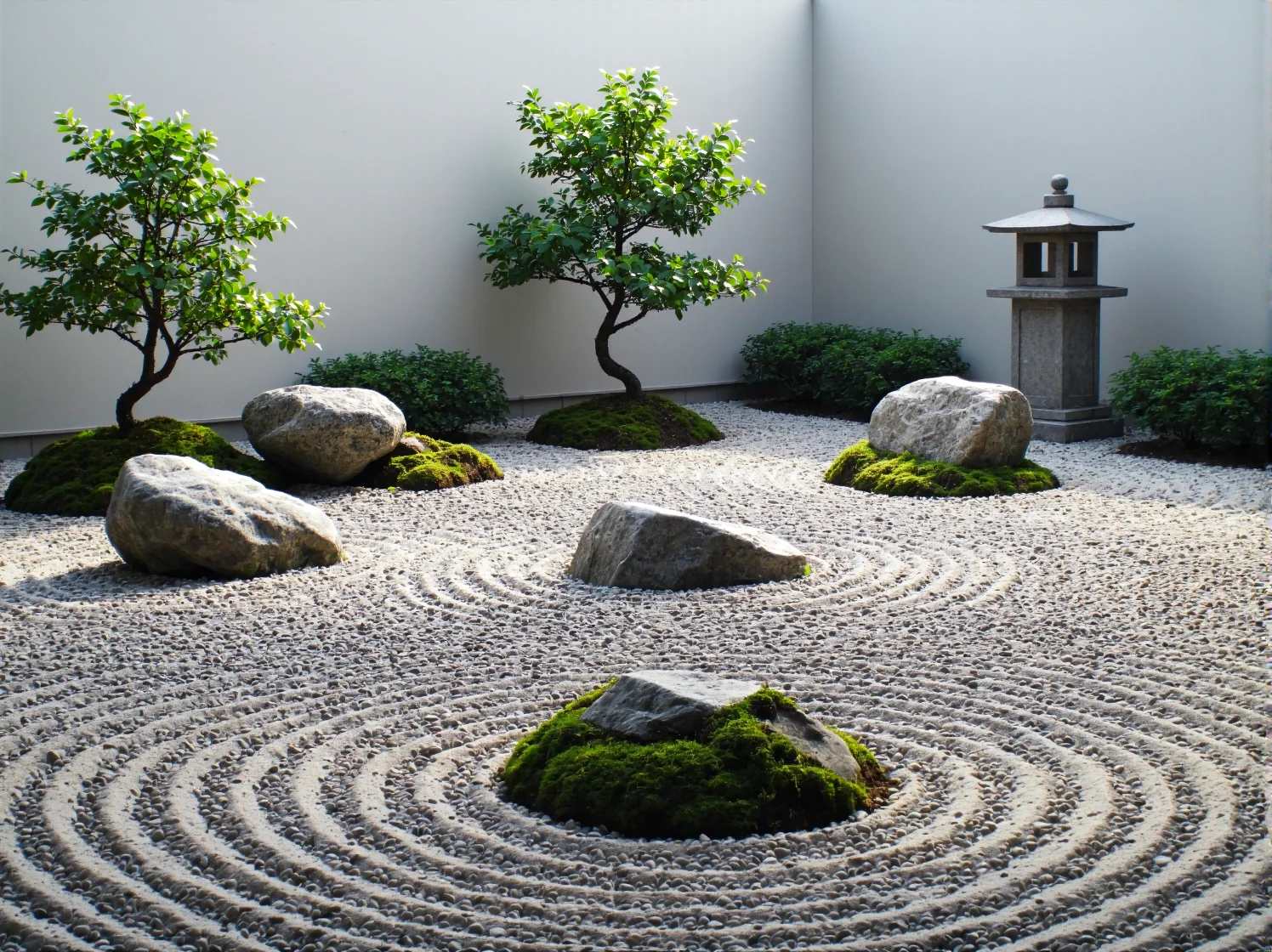 - Jasny żwir lub piasek (Samon): Starannie wygrabiony w fale lub kręgi, reprezentuje wodę – ocean, jezioro lub strumień. Wzory te symbolizują ruch i przepływ, wprowadzając do statycznej kompozycji element dynamiki.