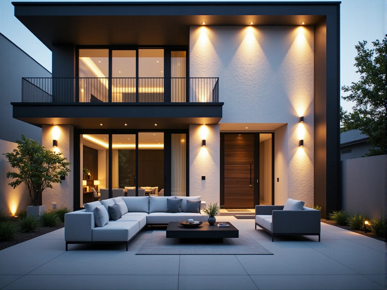 Nowoczesny dom to dom inteligentny. Oświetlenie elewacyjne może być częścią systemu Smart Home, co pozwala na tworzenie zaawansowanych scen świetlnych. Możemy zaprogramować system tak, aby światła włączały się automatycznie o zachodzie słońca (korzystając z danych o lokalizacji) i przygasały do 20% mocy po północy, oszczędzając energię.