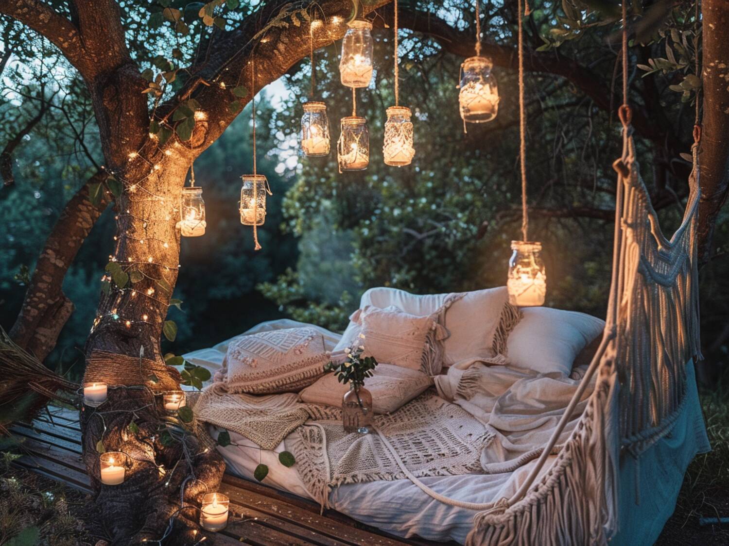 Girlandy świetlne zasilane energią słoneczną to jeden z najpopularniejszych wyborów do altan w stylu boho. Delikatne punkty świetlne rozwieszone wokół altany lub nad miejscem do siedzenia dodają przytulności i tworzą romantyczną atmosferę. Wybierając girlandy, warto postawić na modele z ciepłym światłem, które lepiej wpisuje się w charakter boho.