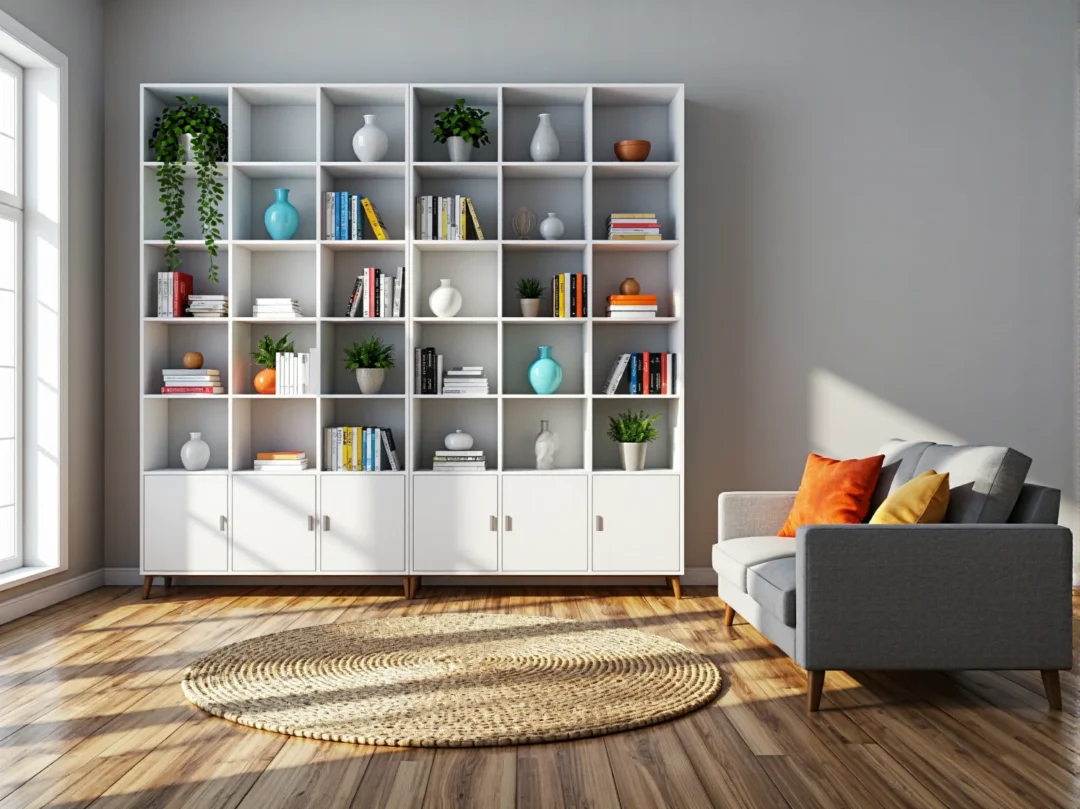 Odnowiony regał w nowoczesnym salonie – efekt końcowy renowacji starego mebla.