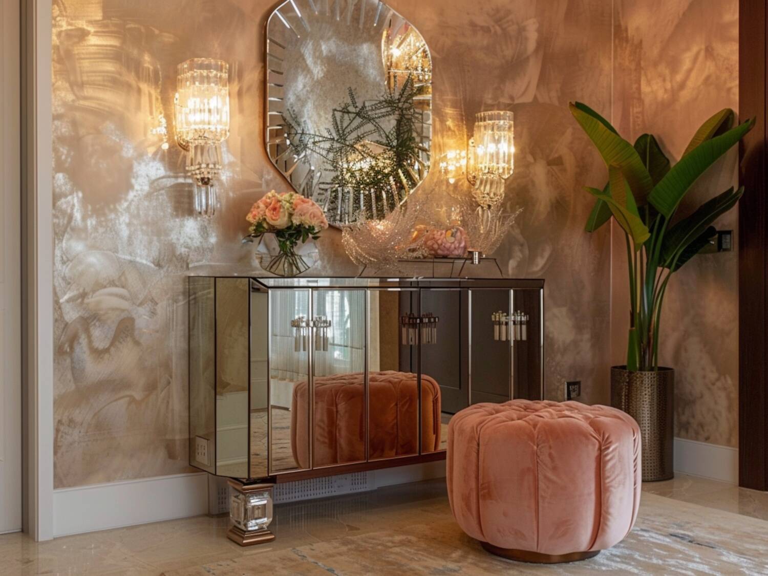 Komody z lustrzanymi frontami to elegancki i funkcjonalny dodatek do przedpokoju w stylu glamour. Poza przechowywaniem drobiazgów, takich jak rękawiczki czy czapki, stanowią element dekoracyjny, który dodaje przestrzeni blasku i luksusu.